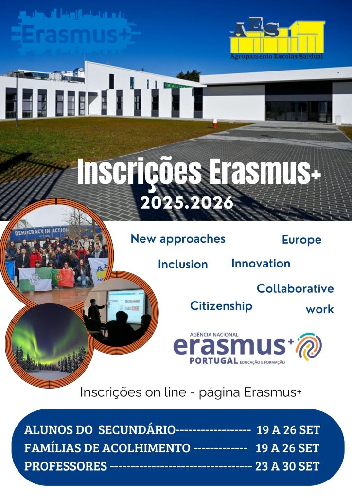 Inscrições Abertas: Mobilidade de Alunos: https://sites.google.com/escolasardoal.com/erasmussardoal/mobilidades/alunos Mobilidade de Professores: https://sites.google.com/escolasardoal.com/erasmussardoal/mobilidades/professores Famílias de Acolhimento: https://sites.google.com/escolasardoal.com/erasmussardoal/mobilidades/alunos