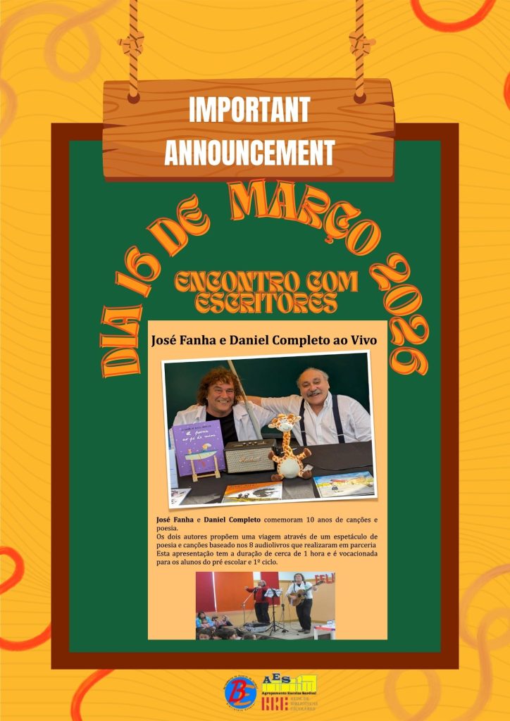 Dia 16 de março de 2026, as crianças e alunos dos Jardins de Infância e 1º ciclo participaram num encontro com José Fanha e Daniel Completo através de uma viagem de poesia e música.