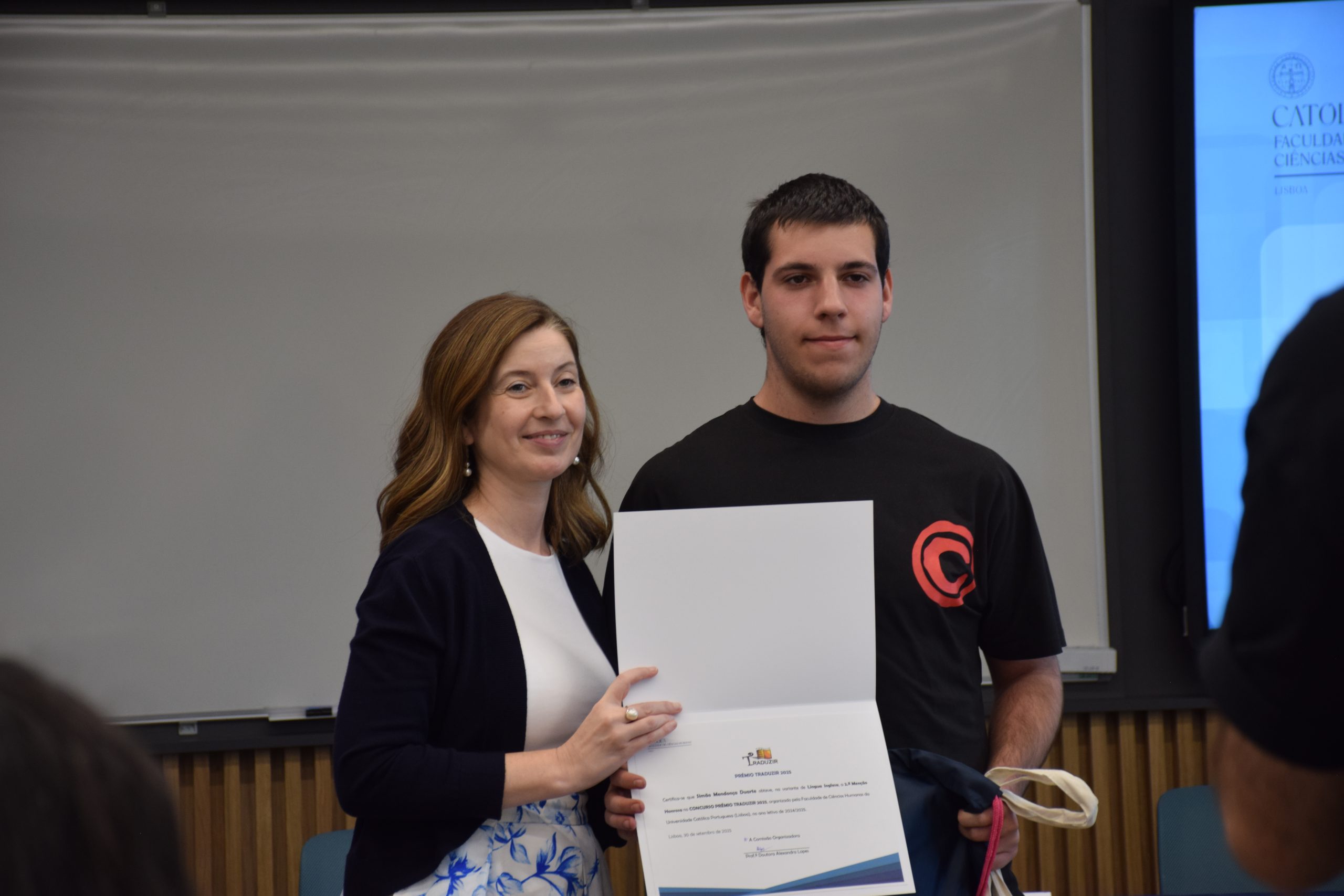 No passado dia 30 de setembro (Dia do Tradutor), o aluno Simão Duarte do 12ºB, recebeu uma menção honrosa (terceiro lugar) na Universidade Católica Portuguesa, em Lisboa, pela sua tradução de um texto em inglês de entre 473 concorrentes. O concurso intitulado “Traduzir 2025”, é dinamizado pela mesma universidade e o Simão foi o primeiro aluno da nossa escola a ser premiado neste concurso.