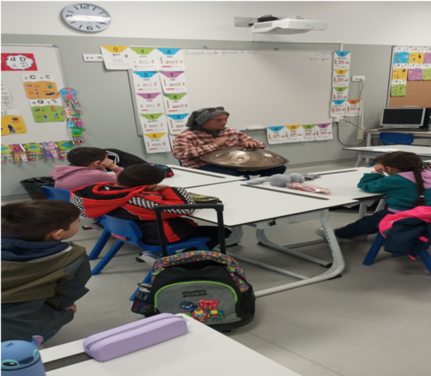 Para tornar a experiência ainda mais enriquecedora, os alunos também tiveram contacto com um instrumento musical pouco conhecido: o Hung Drum. Os visitantes explicaram como funciona este instrumento, de onde vem e demonstraram alguns sons, criando um ambiente calmo e envolvente na sala.